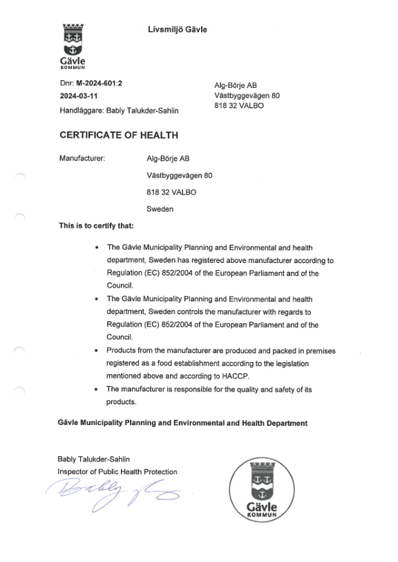 منتجاتنا معتمدة من قبل الإدارة الوطنية للأغذية في السويد، وتتوافق مع معايير مجلس الأغذية الصحية السويدي. كما تحظى Algine Plus بموثوقية عالمية، حيث تمت الموافقة عليها من قبل Health Canada تحت رقم الاعتماد 80007659.
